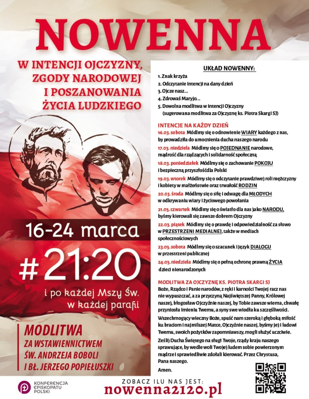 #nowenna w intencji Ojczyzny, zgody narodowej i poszanowania życia ludzkiego, za wstawiennictwem św. Andrzeja Boboli i bł. ks. Jerzego Popiełuszki. Każdego dnia zostanie przeprowadzona transmisja internetowa, z miejsca, gdzie modlitwę prowadzić będą biskupi. My zapraszamy do wspólnej modlitwy w naszej wspólnocie parafialnej o 21:00 do kaplicy w domu katechetycznym. Apel, Adoracja Najświętszego Sakramentu, modlitwa w intencji Ojczyzny.