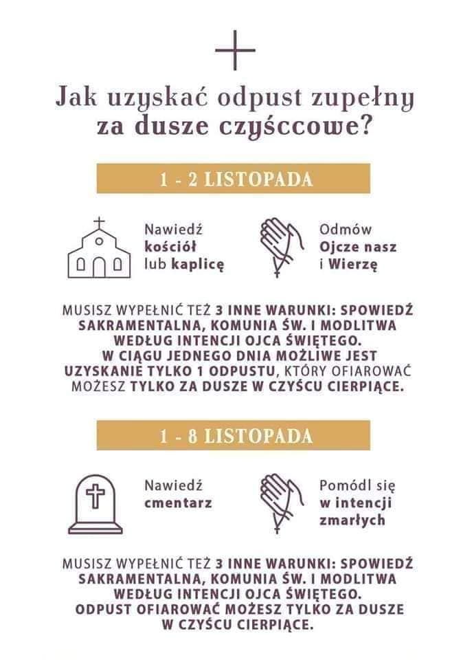 Od 1 do 8 listopada włącznie można codziennie zyskać odpust zupełny za pobożne nawiedzenie cmentarza i odmówienie modlitwy za zmarłych. Trzeba także spełnić zwykłe warunkami otrzymania odpustu, czyli być w stanie łaski uświęcającej, przyjąć Komunię Świętą, pomodlić się w intencjach wyznaczonych przez papieża, wykluczyć przywiązanie do jakiegokolwiek grzechu. Odpust można ofiarować wyłącznie za zmarłych.